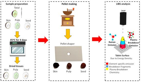 Sample preparation, pellet making, and LIBS analysis of the skin, pulp, and seeds of the Loureiro and Vinhão cultivars.