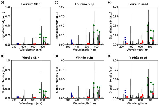 Figure 3 presents the average signal intensity relating to the skin, pulp, and seeds of the Loureiro and Vinhão cultivars in S1 (47 days after veraison). The diagram incorporates the respective wavelengths corresponding to each element identified according to the generated database. Ca is characterized by five peaks at 317.936 nm, 617.128 nm, 646.273 nm, 649.378 nm, and 866.097 nm. Mg exhibits three peaks at 279.535 nm, 280.24 nm, and 285.18 nm; N shows six peaks at 744.2 nm, 746.753 nm, 821.533 nm, 822.248 nm, 824.184 nm, and 867.938 nm.