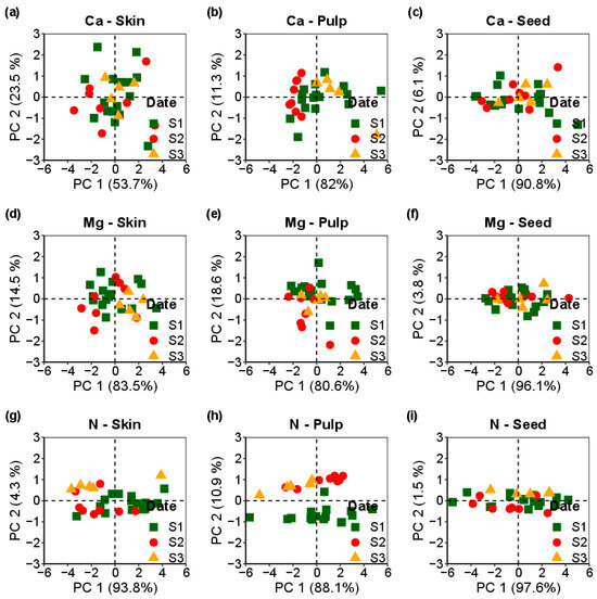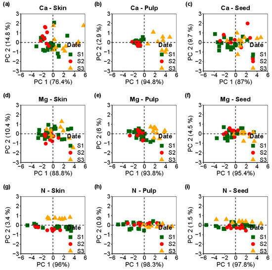Principal component analysis of Loureiro cultivar across three assessment dates (S1(■), S2 (●), S3(▲)); (a–c) represent calcium (Ca) concentrations in skin, pulp, and seeds, while (d–f) show magnesium (Mg) concentrations, and (g–i) illustrate nitrogen (N) concentrations in the corresponding tissues.