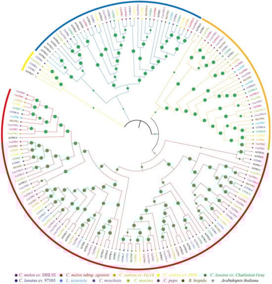 The number of genes in a species depends on the gene duplication events that occur at irregular frequencies across subspecies []. Using melon chromosomes as a reference, integrated gene mapping was performed based on gene covariance among cucurbit species. Similar to previous studies, an integrated gene map with 34 loci was obtained, of which 4 were shared, and polymorphisms (present/absent) were observed at 30 loci []. In the comprehensive gene map, members of Cucurbiteae tribe always appeared at the same locus, and there were 10 loci with only TPR gene members from the Cucurbitaceae species. This reflects the evolutionary relationships between TPR genes in Cucurbitaceae species.