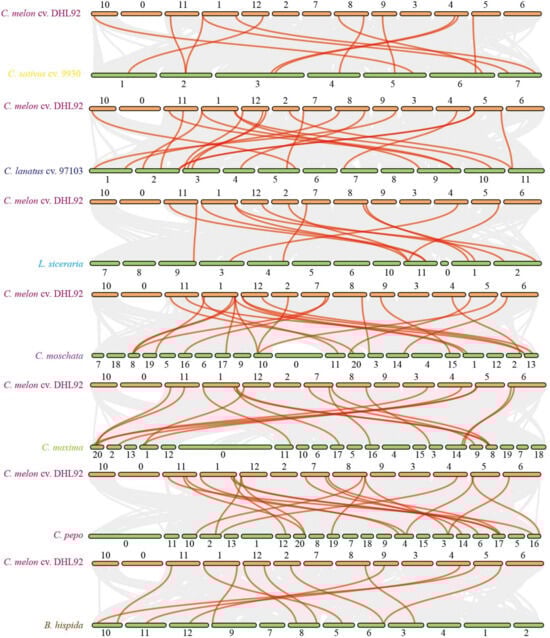 Plant genomes differ in the location and order of genes on their corresponding chromosomes, and comparative analysis between species genomes can illustrate genome evolution []. Relationships between species can be investigated by identifying conserved genes in pairs that exist between them []. To further understand the evolutionary relationships of TPR genes across species, collinearity analysis was performed using melons from seven other species. Seventy CmTPR genes in melon were linked to seven CsTPR genes and seven ClTPR genes in cucumber and watermelon, respectively (Figure 2 and Table S5). Sixty percent of the CmTPR genes had collinear connections with six LsiTPR genes and six BhiTPR genes in bottle gourd and wax gourd, respectively (Figure 2 and Table S5). More TPR homologous genes were identified in the Cucurbitaceae tribes (C. moschata, C. maxima, and C. pepo), and covariance analysis of melons with these species revealed that 80% of the CmTPR genes were linked to 10 CmoTPR genes (Figure 2 and Table S5). In total, 60% of the CmTPR genes were collinearly linked to seven CmaTPR genes, and 50% CmTPR genes were collinearly connected with six CpTPR genes (Figure 2 and Table S5). The results of the collinear analysis were consistent with those of the phylogenetic tree analysis, where the TPR genes with collinear relationships tended to be on similar branches in the phylogenetic tree. Our results suggest that TPR genes are similarly characterized in different species, and CmTPR genes are reliably identified in melon.