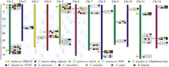 Interspecific covariance analysis of melon ‘DHL92′and other Cucurbitaceae. From top to bottom: C. sativus cv. 9930, C. lanatus cv. 97103, L. siceraria, C. moschata, C. maxima, C. pepo, and B. hispida.