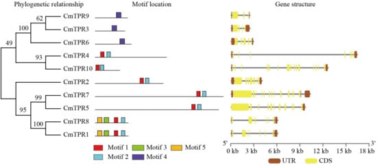 Phylogenetic tree, motif, and gene structure analysis of CmTPR genes in melon. Motifs 1–5 were conservation motifs in the MEME structure diagram. Brown and yellow columns and black lines represent UTR, CDS, and introns in the exon–intron structure diagram, respectively.