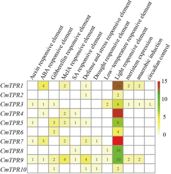 Cis-regulator element analysis of CmTPR genes in melon. Cis-regulator elements were identified in the promoter region of CmTPR gene. The gradient color from white to red and the numbers in the grid indicate the number of different cis-regulator elements in CmTPR.
