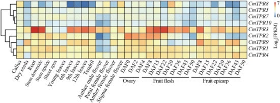 Using a published RNA-seq dataset, the expression of CmTPR genes was examined in different organs and developmental periods using an online website (https://melonet-db.dna.affrc.go.jp/ap/top, accessed on 15 November 2023) []. Heatmaps were generated to illustrate the spatiotemporal expression of callus, dry seeds, root, stem (downside and upside), shoot apex, leaves (young and 6th–12th), tendril, flower (anther male, petal female, and stigma female), ovary (0–4 DAF (days after flowering)), fruit flesh (8–50 DAF), and fruit epicarp (8–50 DAF).