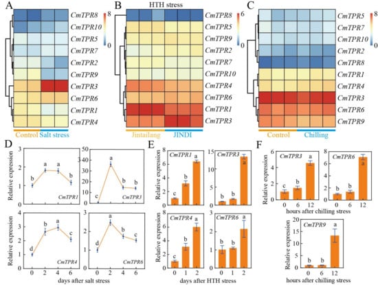 Expression profiles of CmTPR gene in melon under different abiotic stresses. (A) Heatmap of CmTPR expression under normal growth conditions and salt (NaCl) stress. (B) Heatmap displaying CmTPR expression in tolerant (‘JINDI’) and sensitive (‘Jintailang’) varieties under HTH (high temperature and humidity) stress. (C) Heatmap of CmTPR expression under normal growth conditions and chilling stress. (D) Expression profiles of representative CmTPR genes at 0, 2, 4, and 6 d (days) after salt stress. (E) Expression profiles of representative CmTPR genes at 0, 1, and 2 d (days) after HTH stress. (F) Expression profiles of representative CmTPR genes at 0, 3, and 6 h (hours) after chilling stress. Different letters in the bar graph indicate significant differences in the expression of representative CmTPR between control and other time points at a significance level of 0.05.