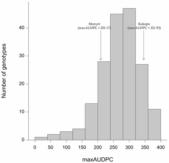 Distribution of the adjusted means of maxAUDPC for 182 F1 hybrids and the parents at 105 dpi. The positions of the parents (Monyet and Kokopo) are indicated in the figure.