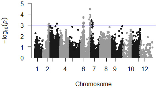 Continuous mapping was performed in 135 F1 hybrids that were genotyped and phenotyped. Because of the limited resources to construct linkage maps and perform QTL analyses in odd ploidy levels such as triploids, and the low sequencing depth associated with DArTSeq, which is often associated with genotype miscalling in polyploids, genotype calling was not carried out for the F1 hybrids. Instead, continuous mapping [27,28] was performed by regressing the adjusted means of maxAUDPC on the allele frequencies per SNP marker locus, followed by calculating p-values to assess the significance of the phenotype-SNP association and the estimation of the additive effects. The allele frequency bias was corrected using the formula in Equation (6).