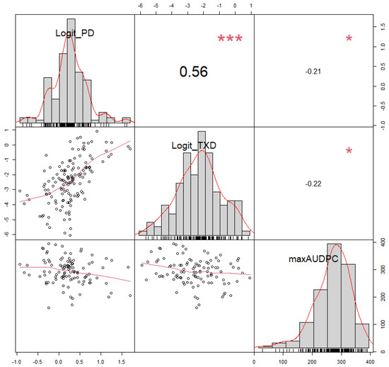 Pearson’s correlation between the F1 adjusted means of the weevil traits (logit_PD and logit_TXD [28]) and the Xvm trait (maxAUDPC). *** p ≤ 0.001, * p ≤ 0.05.