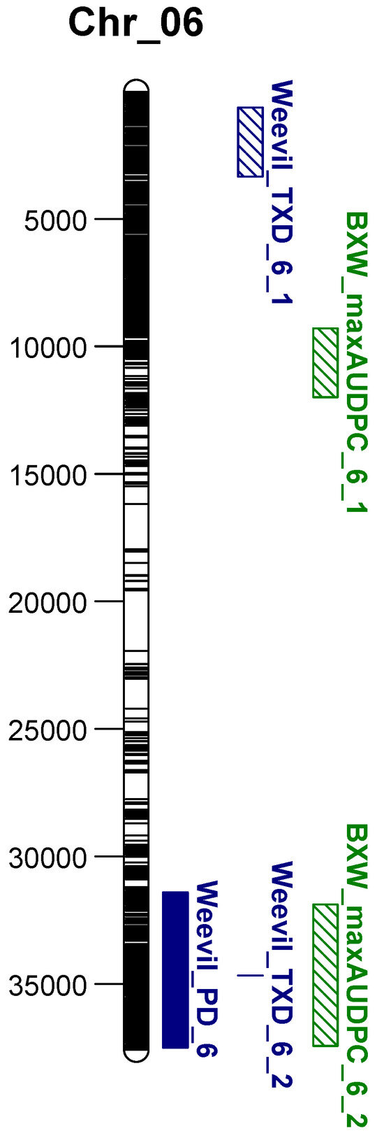 Chromosome 6 of the markers in the Monyet × Kokopo population based on the physical map of DH Pahang reference genome version 2 showing the QTL for resistance to weevils (blue) and BXW (green) on the right side of the bar. The beginning and the end of each QTL are represented by the first and the last significant marker position on the chromosome. Full QTL bar = Kokopo as the main source of resistance, barred bar = Monyet as the source of resistance. The left side of the bar shows the physical position of the markers in Mbp. PD = peripheral damage of the corm; TXD = total cross-section damage of the corm.
