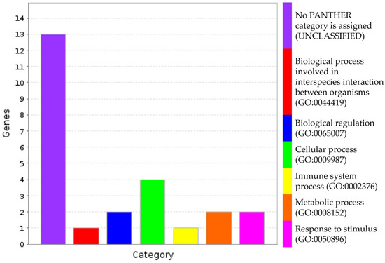PANTHER GO-slim biological processes of the 18 putative genes returned 33 hits (https://pantherdb.org, (accessed on 9 November 2023)).