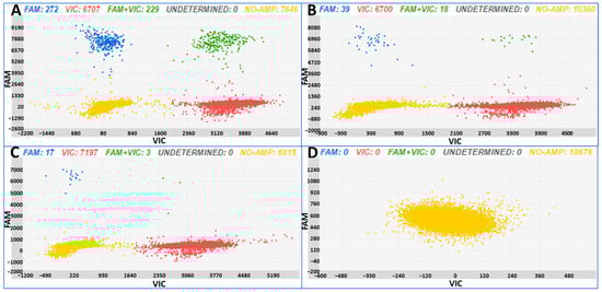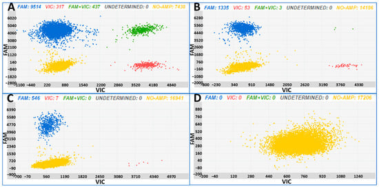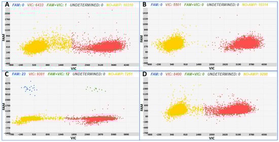 Chip digital PCR (cdPCR) analysis using Tom-dig assay (which generates a VIC-positive signal, visualized as a red dot) and BC3-dig assay (which generates a FAM-positive signal, visualized as a blue dot). Scatter plots show the VIC signals on the X-axis and the FAM signal on the Y-axis. All data points from every well on the chip are shown in the figure. The samples analyzed are as follows: (A) 20 ng of Mariner DNA, (B) 20 ng of Sailor DNA, (C) 20 ng of Rossoro DNA, and (D) 20 ng of Wilson DNA. Amplifications were obtained in all samples for tomato (red dots) and for B. cinerea in sample C only (blue dots). Green dots (present in Figure (C) only) are partitions in which both amplifications (for tomato and B. cinerea DNAs) occurred, whereas yellow dots are negative PCR partitions without any target amplification.