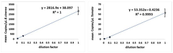 Regression curves obtained by plotting the copies of B. cinerea (left) and of tomato endogenous gene (right) against dilutions of total DNA extracted from tomato-infected plants. Error bars are reported.