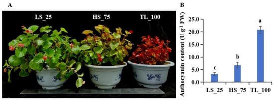Phenotypes (A) and the relative content of anthocyanin (B) in the leaves of B. semperflorens under different light conditions: TL_100 (9500–9600 lx), HS_75 (6800–7000 lx), and LS_25 (4300–4500 lx). Values given in the form of mean ± SE (n = 3). Significant differences were analyzed using Duncan’s multiple range test; bars with different letters (a, b, c) are significantly different from each other (p < 0.05).