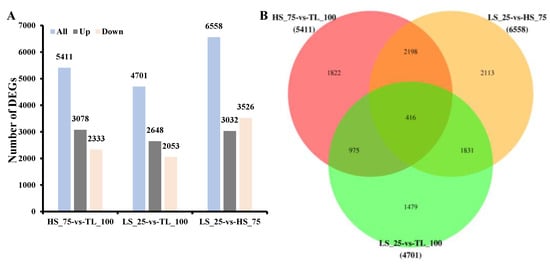 Differential gene expression was assessed using DESeq software (version 1.18.0) [32]. A total of 5411 DEGs were identified between HS_75 and TL_100, with 3078 up-regulated and 2333 down-regulated (Figure 2A; Table S2). In the LS_25 vs. TL_100 comparison, 4701 DEGs were identified, with 2648 up-regulated and 2053 down-regulated (Figure 2A; Table S3). Between LS_25 and HS_75, there were 6558 DEGs, with 3032 up-regulated and 3526 down-regulated (Figure 2A; Table S4). Additionally, 416 DEGs were commonly expressed across all three comparisons (Figure 2B; Table S5).