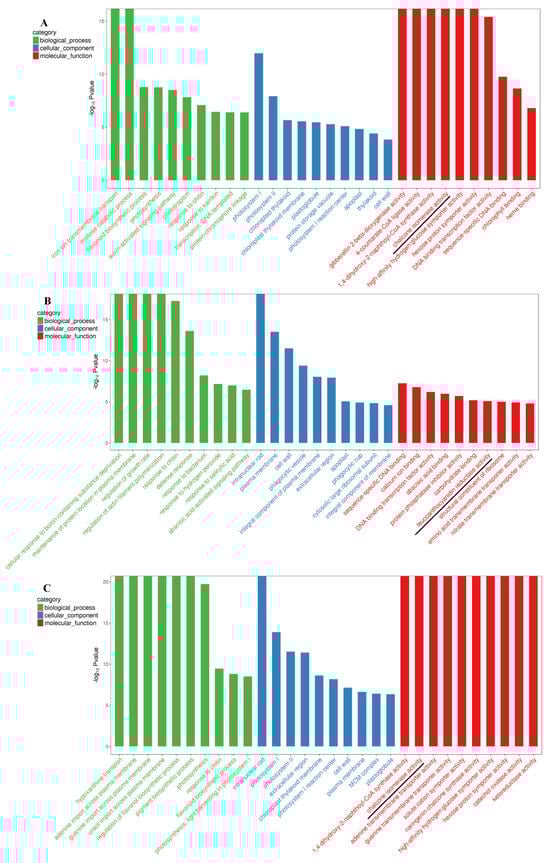 GO enrichment of top 30 terms of DEGs that were detected in the three comparisons of HS_75–vs–TL_100 (A), LS_25–vs–TL_100 (B), and LS_25–vs–HS_75 (C) in leaves. The blank lines indicate some anthocyanin biosynthesis-related enzymes. The horizontal coordinate shows the GO term and the vertical coordinate indicates the −log10 p value.