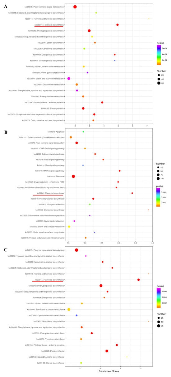 KEGG classification of DEGs that were detected in the three comparisons of HS_75–vs–TL_100 (A), LS_25–vs–TL_100 (B), and LS_25–vs–HS_75 (C). Red line shows the flavonoid biosynthesis pathway item. The x-axis is the enrichment score. The larger the bubble, the more the number of DEGs. The color of the bubble changes from purple to blue to green to red. The smaller the p-value of the bubble, the greater the significance.