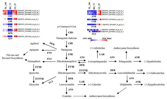 3.4. Analysis of DEGs Involved in Flavonoid Biosynthesis