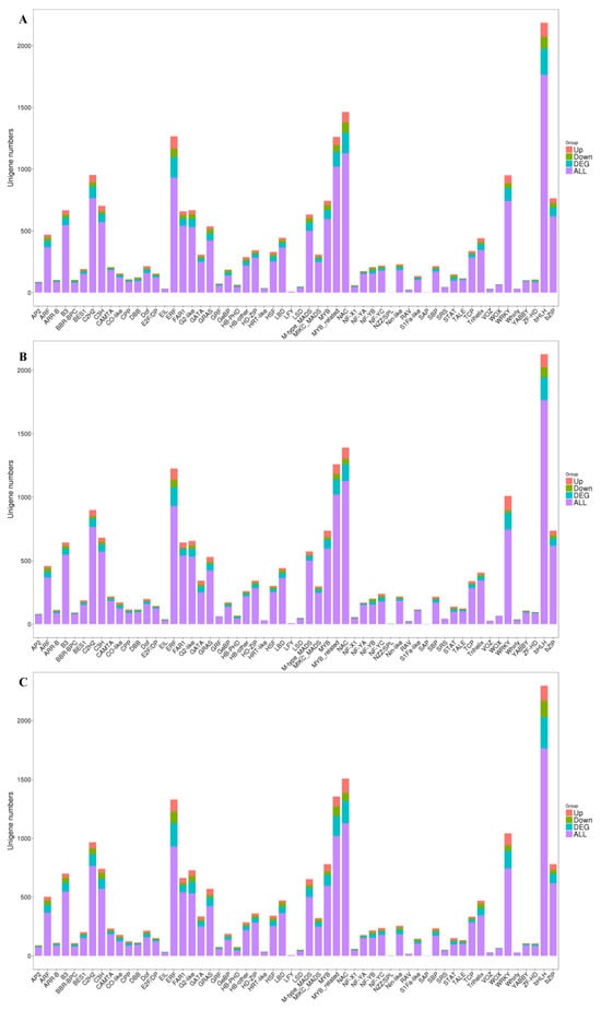 Transcription factors are proteins that bind to specific DNA sequences, which play a key role in gene expression regulation by controlling the transcription of genetic information from DNA to RNA. PlantTFDB (https://opendata.pku.edu.cn/dataset.xhtml?persistentId=doi:10.18170/DVN/GHICUF, accessed on 10 January 2024) is a database of plant transcription factors which contains sequences from 165 plants and 58 families of plant transcription factors, and the top 10 species distribution is shown in Figure S3. The unigene sequence was compared to the transcription factor database by blastx (E-value < 1 × 10−5). A total of 16,363 unigenes were annotated in the transcription factor database, which were distributed in 58 families. The TF comparison results are shown in Figure 6, and the MYB and MYB-related, bHLH (basic Helix–Loop–Helix), WRKY (WRKYGQK), and ERF (Ethylene-Responsive Factor) transcription factors showed a higher number.