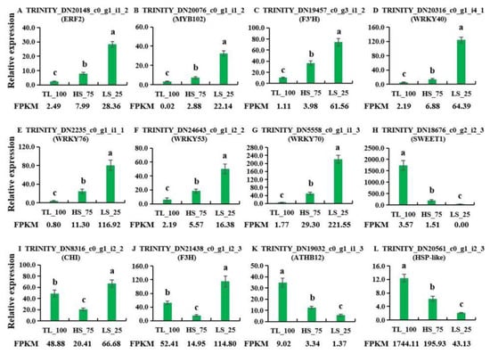 qRT-PCR validation of the transcriptome data. The relative transcript levels of these twelve genes were shown in panel (A) (ERF2), (B) (MYB102), (C) (F3’H), (D) (WRKY40), (E) (WRKY76), (F) (WRKY53), (G) (WRKY70), (H) (SWEET1), (I) (CHI), (J) (F3H), (K) (ATHB12), and (L) (HSP-like). Values given in the form of mean ± SE (n = 3). Significant differences were analyzed using Duncan’s multiple range test; bars with different letters are significantly different from each other (p < 0.05). The sequences of primers are shown in Table S7.