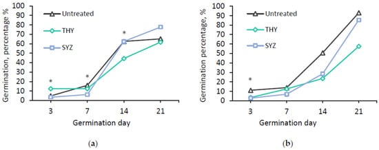 Germination percentage (%) of ‘Jarus’ (a) and ‘Vasariai’ garlic cloves (b) with no additional treatment (untreated) and treated with T. vulgaris essential oil (THY) and S. aromaticum extract (SYZ). “*” sign indicates significant differences between the means according to Tukey (HSD) analysis (p < 0.05).