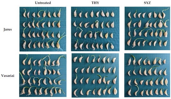 ‘Jarus’ and ‘Vasariai’ garlic cloves with no additional treatment (untreated) and treated with T. vulgaris essential oil (THY) and S. aromaticum extract (SYZ) on the 21st day of storage.