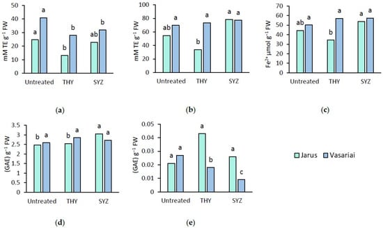ABTS (a), DPPH (b) and FRAP (c) antioxidant activities; total phenolic compounds (d); and total flavonoids (e) of ‘Jarus’ and ‘Vasariai’ garlic cloves with no additional treatment (untreated) and treated with T. vulgaris essential oil (THY) and S. aromaticum extract (SYZ). Different letters indicate significant differences between the means according to Tukey (HSD) analysis (p < 0.05).
