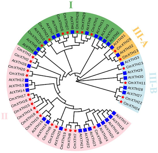 A phylogenetic tree analysis of XTH proteins in melon and Arabidopsis thaliana. (The evolutionary tree was divided into four subfamilies with different colors. The blue square represents Arabidopsis. The red five-pointed star represents the melon).