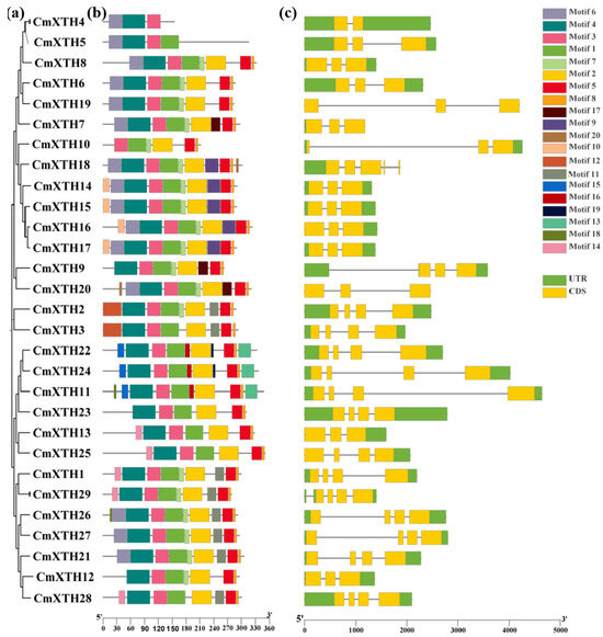 Phylogenetic tree, gene structure, and conserved motifs of melon XTHs. (a) Phylogenetic relationships of 29 CmXTH genes, (b) protein motifs, and (c) gene structures. Horizontal coordinates denote lengths of genes and amino acid sequences.