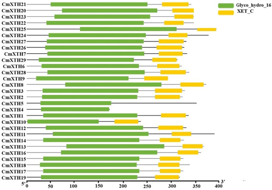A conserved domain analysis of CmXTH proteins. The green box represents the Glyco_hydro_16 domain, while the yellow box represents the XET_C domain.