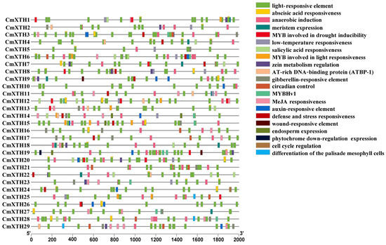 Cis-element analysis of 29 CmXTH gene promoters. Each box is filled with different colors representing different cis-acting elements.