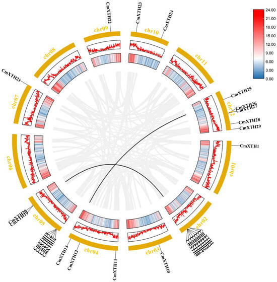 A fragment duplication analysis of the melon XTHs. The black lines represent the fragmentary duplicated gene pair, and the gray lines represent the synteny blocks of the XTH genes in the melon genome. The line and heat map in the outer circle represent gene density on the chromosome.