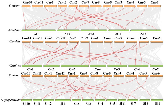 A collinearity analysis of XTH genes between melon and Arabidopsis thaliana, Solanum lycopersicum, and Cucumis sativus. The red lines represent XTH syntenic gene pairs of melon with three other species, and the gray lines represent orthologous genes of melon with three other species.