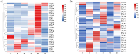 As shown in Figure 8b, the CmXTHs displayed specific expression profiles under different stress times. For example, CmXTH10, CmXTH12, CmXTH23, CmXTH27, and CmXTH28 were mainly expressed after 3 h; CmXTH2, CmXTH7, and CmXTH13 were highly expressed at 6 h, whereas CmXTH11, CmXTH20, and CmXTH22 were up-regulated at 9 h. The expression of CmXTH18 and CmXTH24 reached their maximum at 24 h, while the expression of CmXTH26 decreased under stress treatment. These results indicate that the CmXTH family exhibits different responses to drought and salt stress under different durations.
