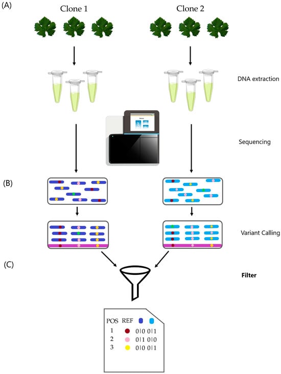 Clone differentiation flowchart. (A) DNA extraction and sequencing were performed on three biological samples per clone. (B) Variant calling analysis was conducted on the six samples following GATK best practice guidelines. (C) Final filtering steps considered filters such as biallelic sites, minor allele frequency (MAF), missing data, depth, genotype, and location within repetitive elements. Visual inspection of a sample of variations confirmed the results. “Filters” is in bold to highlight the importance of this step, as shown in the results.