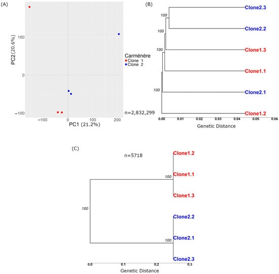 The variant calling process for both clones of Merlot with respect to the reference yielded 5,718,098 raw variants (Table 1), comprising 4,515,484 SNPs, 967,261 insertions, and 302,678 deletions. Figure 3A,B present a PCA and a genetic distance tree, respectively. In the PCA plot, the samples did not cluster by clone, indicating that genetic variations did not separate the samples according to clonal origin. Similarly to Carménère, the genetic distance tree revealed minimal differences between the samples that were insufficient for distinct clonal grouping.