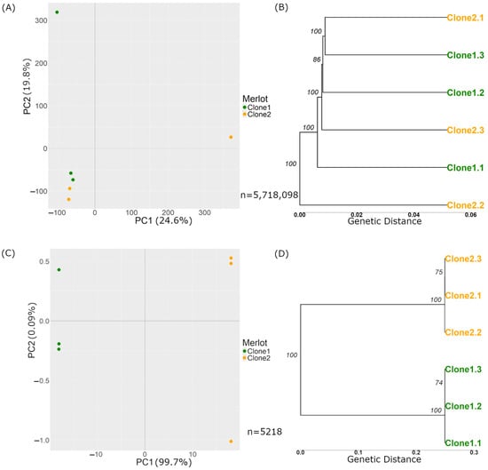 PCAs and trees are based on genetic distance with Merlot variations before and after the filters. (A) and (B) show plots generated before applying the filters described in Section 2.2.3.1, based on n = 5,718,098 variations. (A) PCA plot of the variant calls from the 6 Merlot samples, where the X-axis represents Principal Component 1, and the Y-axis represents Principal Component 2. The numbers next to each component indicate the variance explained by the data, which in this case is 24.6% for PC1 and 19.8% for PC2. (B) Tree based on genetic distance, with the numbers over the nodes representing branch support on a scale from 0 to 100. The X-axis represents the genetic distance, indicating the proportion of differing sites among the samples. (C,D) show plots generated after applying the filters described in Section 2.2.3.1, based on n = 5218 variations (C) PCA plot of the variant calls where the X-axis represents PC 1, and the Y-axis represents PC 2. The numbers next to each component indicate the variance explained, which in this case is 99.7% for PC1 and 0.09% for PC2. (D) Tree of Merlot clone samples after filters.