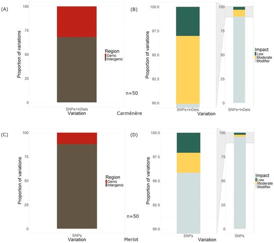 In Merlot, out of the 50 visually inspected variations, 44 were located in intergenic regions, 6 within genes, and 2 in exons (Figure 4C). Notably, no variations were detected in the mitochondrial or chloroplast genomes.
