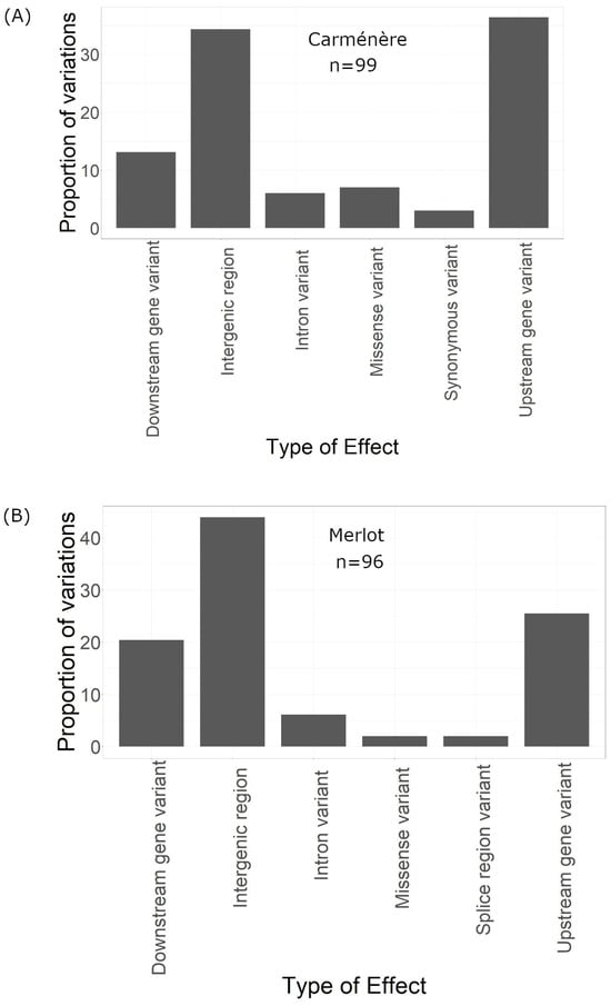 Although the initial number of variations identified in Carménère and Merlot differed significantly (2.8 million in Carménère and 5.7 million in Merlot), the final number of filtered variations was similar, with approximately 5000 for each cultivar. For Merlot, a larger number of individual variations was observed compared to Carménère, as evidenced by the nearly equivalent counts after the first filter of the genotype (13,000 for Carménère and 15,000 for Merlot). Notably, Merlot had nearly half the number of gene variations compared to Carménère. Despite Carménère having 32% of its variations within genes, none was classified as having high impact. Instead, they exhibited low or moderate impact, indicating that the variations are likely synonymous or missense variations, which suggests they may either alter protein efficiency or have no adverse effect on protein function. However, the second and third most frequent location of variation effects occurs in the upstream and downstream regions of protein-coding genes, respectively. We speculate that many of these variations may be associated with gene regulatory functions.
