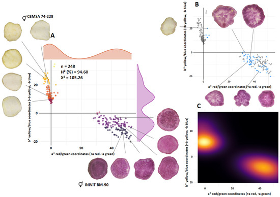 Segregation of flesh color of the progeny resulting from the crossing of a white flesh parent (CEMSA 74-228) with a purple flesh parent (INIVIT BM-90). Scatter plot (A), scatter plot with blue dots representing the codominant trait (B), and contour plot of densities (C).