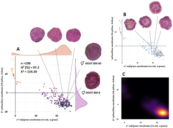 Segregation of flesh color of the progeny resulting from crossing two purple-fleshed parents (INIVIT BM-90 × INIVIT BM-8). Scatter plot (A), scatter plot with blue dots representing the codominant trait (B), and density contour plot (C).