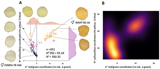 The family ISS-2308 (n = 251), from the cross between a white-fleshed parent (CEMSA 78-326; L* = 74.63) and an orange-fleshed parent (INIVIT BS-16; L* = 62.16), had a segregation ratio of 3.5:1:1.5 (cream-white:yellow:orange) (142:41:68). The estimated broad sense heritability for the lightness trait (L*) was 91.14%. The contour plot of densities (Figure 4B) reflects greater color intensity toward the lower left corner (cream–white color), so there was incomplete dominance of white over orange color (Figure 4).