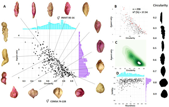The diversity of shapes obtained from the tuberous root of the population (n = 332) from the cross between two parents with defects on the surface of the tuberous root (CEMSA 74-228 [Circularity = 0.83, skin with longitudinal grooves] × INIVIT BS-16 [Circularity = 0.64, skin with horizontal constrictions and longitudinal grooves]) was represented with the combinations of four morphometric descriptors (circularity × aspect ratio, Figure 6A) (roundness × solidity, Figure 6C). Circularity, roundness, and solidity are sensitive indices for sweet potatoes with defects on the skin surface, while aspect ratio can reach proportional values independently of the defects. The progeny resulted to have an average for the circularity character of 0.69, an aspect ratio of 1.95, a roundness of 0.57, and a solidity of 0.93. A total of 44.7% of the population had circularity values between 0.7 and 0.94, indicating that about half of the population had sweet potatoes with a shape close to circular in terms of aspect ratio; the population with values above 2–3 (two to three times longer than wide) was 42.5%.