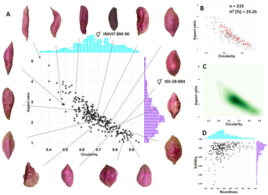 Similarly, the diversity of forms obtained from a tuberous root in the full sib family ISS-2311 (n = 246), resulting from two parents without defects on the surface of the tuberous root (smooth skin) (INIVIT BM-90 [Circularity = 0.67] × ISS-18-004 [Circularity = 0.81]), was represented with the combinations of four morphometric descriptors (Figure 7). Circularity ranged from 0.41 to 0.92, with 48.75% of the population in the range of from 0.6 to 0.75 (Figure 7A). The aspect ratio ranged from 1.09 to 5.34, with 50.0% in the range of from 2 to 3. Considering that the parent INIVIT BM-90 has an AR = 2.55 and ISS-18-004 has an AR = 1.83, the quantitative inheritance of this trait and the cumulative effect of multiple genes is confirmed.