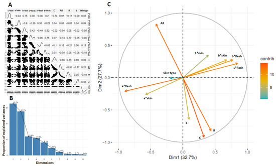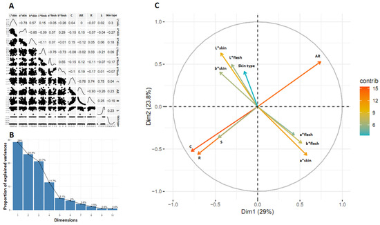 Results of the progeny obtained from crossing two parents with defects on the surface of the tuberous root (CEMSA 74-228 × INIVIT BS-16). Correlation matrix of 11 variables (A), proportion of variance explained by each dimension (B), and distribution of the correlation values of the variables in the first and second dimensions (C).