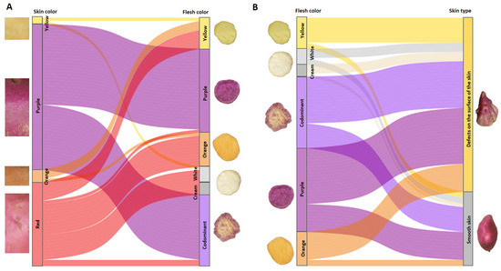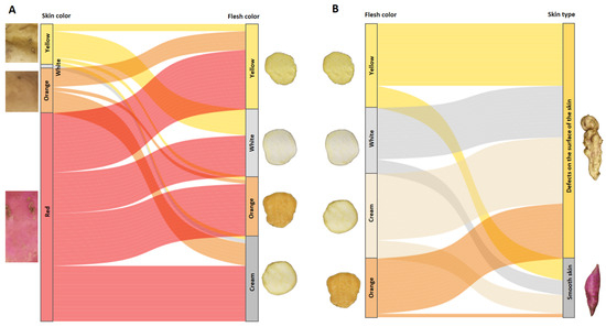 To determine if there was a relationship between different skin colors and a specific flesh color, and between flesh colors and skin type, alluvial plotsdiagrams of trends between these traits were made. Figure 10A,B shows the result for the segregating population between two parents with defects on the surface of the tuberous root, one with red skin and orange flesh (INIVIT BS-16), and another with cream skin and white flesh (CEMSA 74-228).
