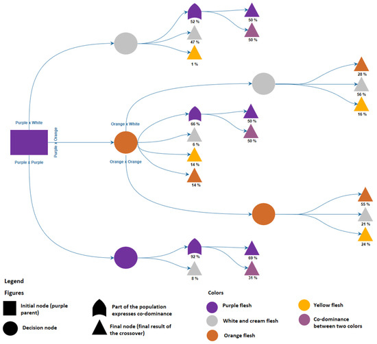 To determine whether or not there was independent segregation between the skin color, flesh color, and tuberous root shape traits, an alluvial trend plot was developed between these traits. For this purpose, the ‘ggalluvial’ package using RStudio 2023.03.1 software was used. In addition, a decision tree model was developed. Different subsets of the data set were created by partitioning by decision nodes. To predict the outcome at each decision node, the probability obtained in the segregating populations of I. batatas was used. For the tree structure, the software EdrawMax ver. 12.5 for Windows was used.