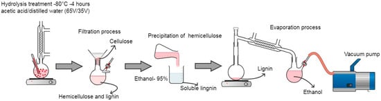 The nutshell was crushed in a blade mill with a mesh of 1 mm in diameter and brought to dryness at 70 °C for 48 h. For the extraction of lignin, a hydrolysis treatment was carried out with a mixture of acetic acid (AC) and distilled water (AD), 65/35 (v/v). A total of 50 g of ground dried nutshell was added to a 4 L glass reactor, and the AC/AD mixture was added at a 1:10 (w/v) ratio and then heated to 80 °C, with constant stirring for 4 h. The lignocellulosic extract obtained from the hydrolysis was filtered by gravity in a porcelain Büchner funnel with a nylon mesh filter. The solid part was dried at 70 °C for 48 h. The filtered extract was precipitated 3 times in 95% ethanol, where hemicellulose was obtained. The soluble lignin was rotary evaporated to remove the ethanol and thus purify the lignin [], as in Figure 1.