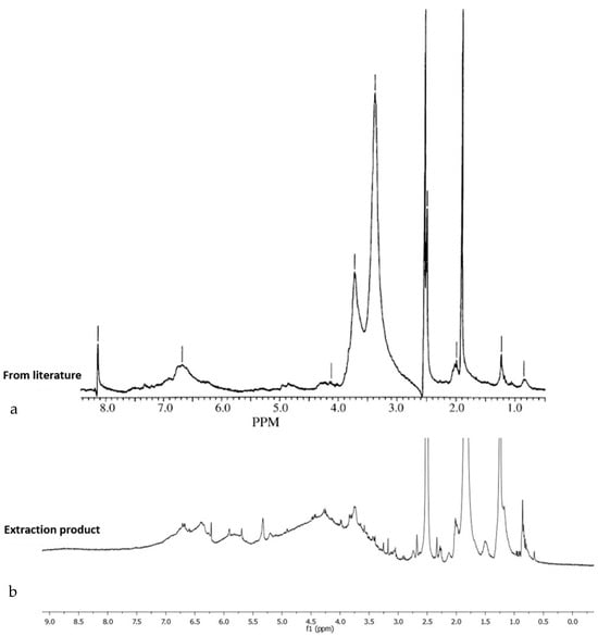 Figure 2 shows the 1H-NMR spectrum of the lignin extracted from the nutshell, as well as the simplified chemical structure of lignin for the identification of the most important signals. Additionally, a comparison of the spectrum of the nut shell extraction product of this work and a spectrum of lignin reported in the literature [] is presented, and the great similarity of signals that exists between both spectra confirms the successful obtaining of lignin from the extraction method under the mild conditions reported in this work.