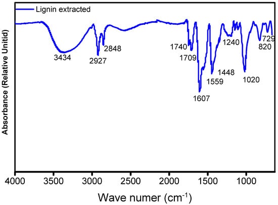 Being a natural polymer, the structure of lignin is not well defined, and this was evidenced by the appearance of various signals, of which the most important were identified; in the region of 6.2 to 7.5 ppm, the signals corresponded to the aromatic protons of lignin, specifically those attributed to the structures known as “syringyl propane” and “guaiacyl propane”. On the other hand, the signal covers approximately 3.5 to 4.0 ppm. This is attributed to the protons of the methoxy groups (CH3-O) that are distributed in different positions throughout the general structure of lignin. There are some aliphatic hydrocarbon groups in the complex structure of lignin, mainly in the side chains of lignin, and these are observable in the region of 0.8 to 2.0 ppm of the spectrum. On the other hand, the lignin sample analyzed by FTIR showed the presence of the characteristic functional groups of this polymer, such as the phenolic hydroxyl and aliphatic structures, in the broad band of 3500 to 3350 cm−1. The bands centered at approximately 2.927 to 2.848 cm−1 arise predominantly from the stretching of the carbon-hydrogen bonds in the methoxy groups (CH3-O), methylene groups (CH2), and methine groups (CH) of the side chains. The bands observed in the range of 1700 cm−1 indicate the presence of unconjugated carbonyl groups. Specifically, the bands at 1716 and 1711 cm−1 are attributed to the esterification of the phenol and alcohol groups of the propane chain (Cα and Cγ) that have been previously reported for extraction processes using acetic and formic acid. The vibration of the aromatic skeleton of lignin was recorded in the band range of 1559–1607 cm−1. The signal at 1240 cm−1 is due to the stretching of the guaiacyl units (G), where deformations of these units can also be seen at 1020 cm−1. The signals in the range of 820 cm−1 represent the vibrations of the CH plane of the guaiacyl units. Finally, asymmetric flexions of the HCCH groups are observed at approximately 730 cm−1. Figure 3 shows the FTIR spectrum of the lignin sample extracted from the walnut shell, and all the signals described above can be observed. The results obtained from this analysis are in accordance with previously published research [,].